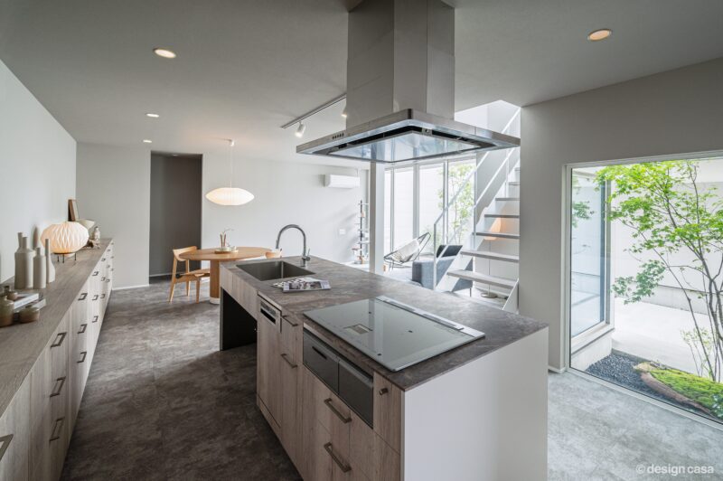 キッチンは濃いグレーのスタイリッシュなデザインを採用したいから、床は石目調のフロアタイルにして、