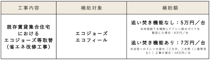 ヒートポンプ給湯機等の導入が難しい既存賃貸集合住宅向けに、小型の省エネ型給湯器(エコジョーズ等)への取り替えを促進するための支援する補助制度です。